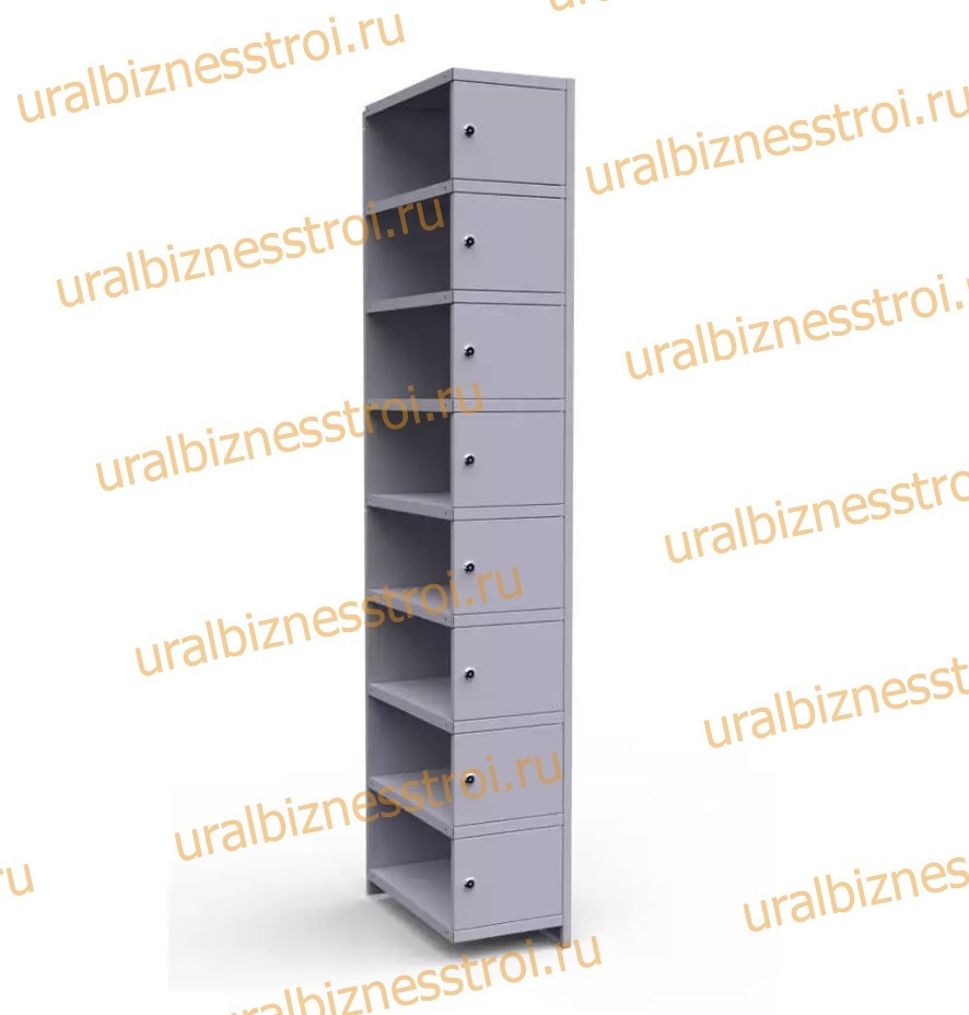 • Модульный шкаф для сумок ШРСо/д-8 имеет стандартную ширину 300 либо 400мм состоит из одной вертикальной секции, 8 ячеек с 8 дверями.