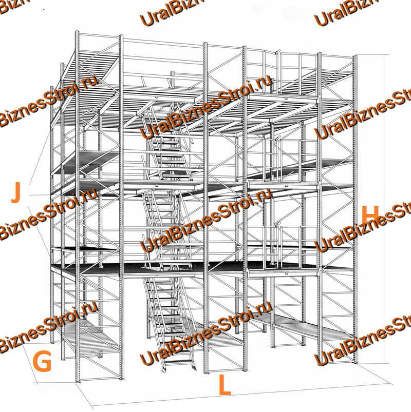 Устанавливается на рамах стеллажа, служащих базой полочных или паллетных стеллажей. При отдельной установке платформы она выполнена в формате полноценного уровня, а на него помещаются стеллажи для расстановки определенных грузов. Пол этажа застилается металлической решеткой, П-образный профиль или профилированными листами, фанерой.
